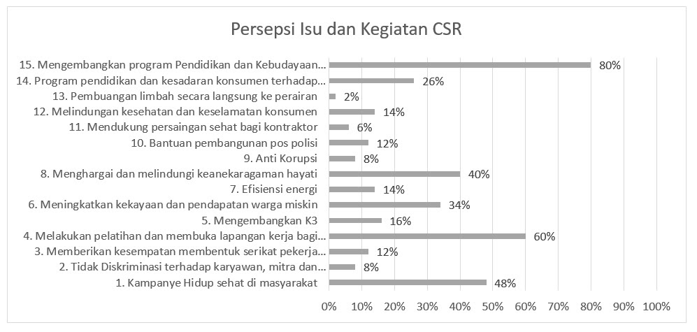 Tiga pilihan jawaban paling tinggi yang dipilih, merupakan isu dan kegiatan yang termasuk di dalam subjek inti pelibatan dan pengembangan komunitas atau community involvement and development dalam CSR. Artinya dari tujuh subjek fokus CSR, yaitu tanggung jawab tata kelola perusahaan, HAM, Tenaga Kerja, Lingkungan, Praktek Berkeadilan, Konsumen dan Community development (Comdev), maka responden lebih banyak memilih subjek yang terakhir yaitu Comdev.