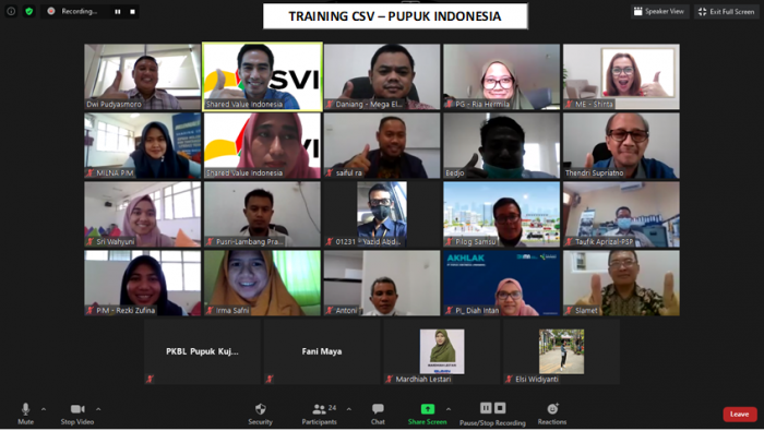 Training Creating Shared Value (CSV) untuk Pupuk Indonesia telah diselenggarakan secara in house training pada tanggal 11-12 November 2020. Metode training secara online meeting, menggunakan aplikasi zoom meeting yang disediakan oleh ISVI, sehingga bisa diakses oleh seluruh peserta dari tempatnya masing-masing.